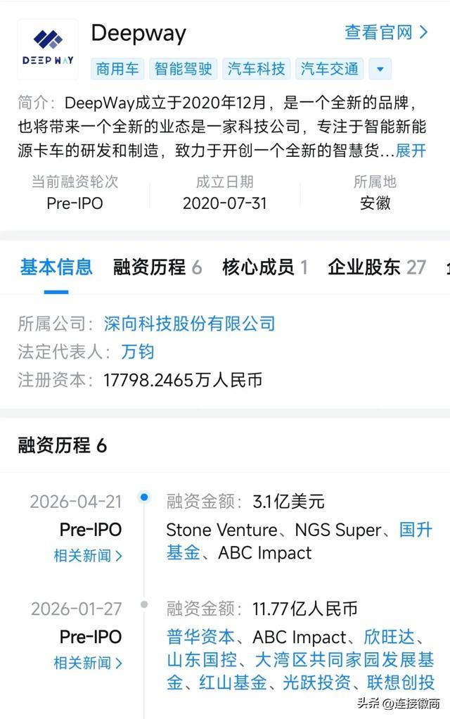 4月21日,安徽货运自动驾驶独角兽DeepWay深向科技宣布Pre-IPO轮又完成一笔大额融资,累计募集资金已超3.1亿美元地方配资网,创下重卡自动驾驶行业近五年最大单轮融资规模纪录。